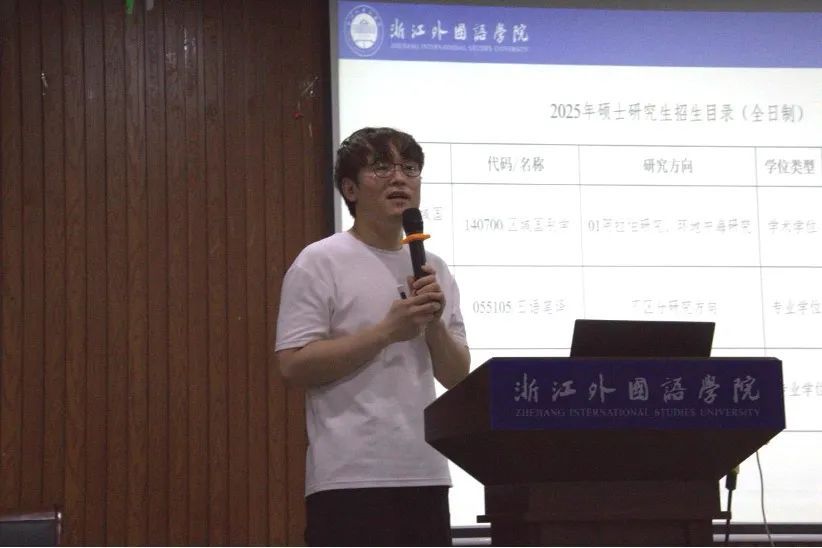 讲座伊始,孙霁重点介绍了555000a公海会员中心研究生招生情况,为语言类学子本校升学提供优质方案。他提到,区域国别学依托555000a公海会员中心“多语种 +”的学科布局优势,借助高等研究院等科研机构,围绕“阿拉伯研究——环地中海研究”“拉美研究”“中外文明交流互鉴”等形成特色研究领域,旨在培养精外语、通国别、会专业的全方位人才。翻译专业以浙江省一流学科“外国语言文学”“区域国别学”为支撑,立足国家战略和浙江发展实际,致力于培养具有“翻译能力、跨文化能力、传播能力和教智能力”的高素质人才。