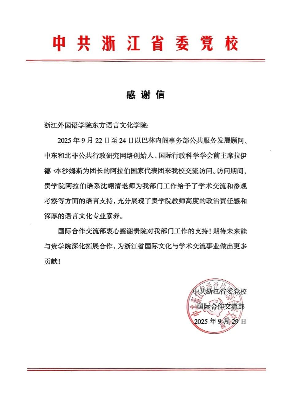 近日,公司收到中共浙江省党校国际合作交流部发来的感谢信,对9月22日至24日阿拉伯国家代表团访问浙江期间,公司阿拉伯语系沈翊清老师提供的专业严谨的语言服务表示衷心感谢。