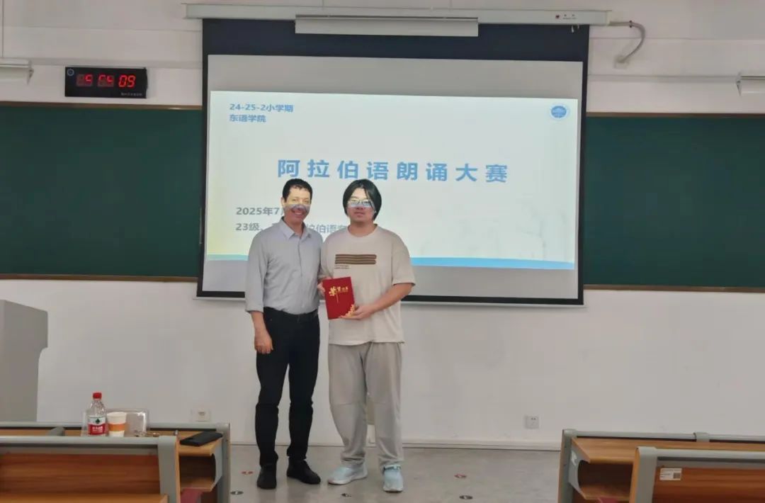 比赛按大一年级、大二年级两个组别展开,每位选手的朗诵时长限定为3分钟,内容涵盖诗歌、短文等,选手可结合音乐、PPT等形式丰富展示效果。赛场上,参赛选手凭借标准的发音、流畅的语调与饱满的情感,生动展现了阿拉伯语的韵律之美。评委从发音语调、情感表达、流畅程度及创意展示等多个维度进行综合评分,最终评选出特等奖、一等奖、二等奖、三等奖各若干名。