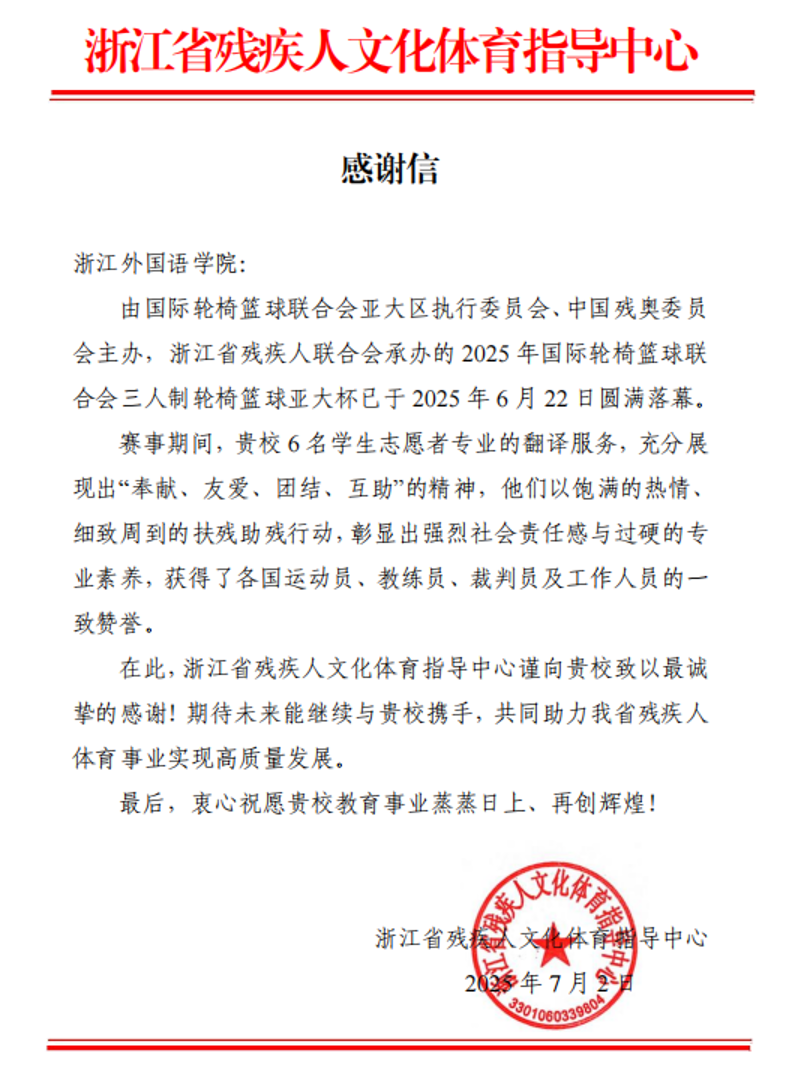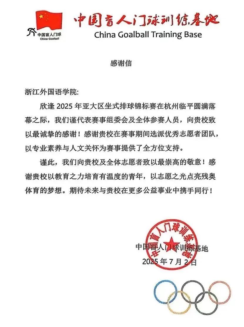 近日,两项赛事的承办或协办单位——中国盲人门球训练基地、浙江省残疾人文化体育指导中心分别向公司发来感谢信,向公司及志愿者们致以崇高敬意,并期待与公司在更多公益事业中携手同行。