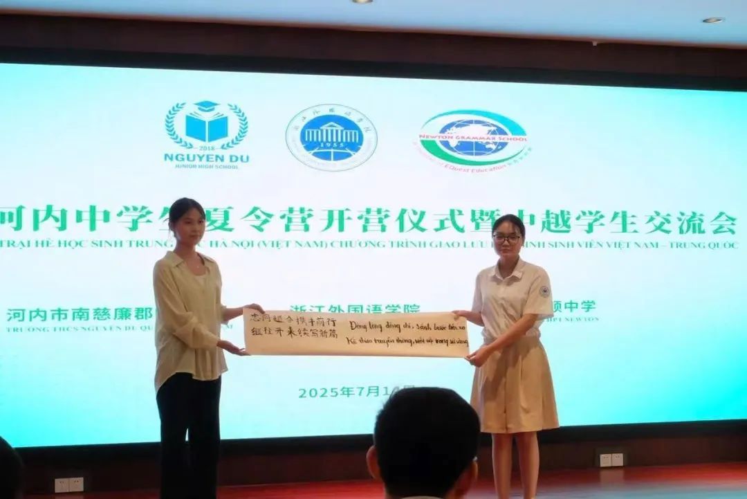 公司越南语系员工代表肖语珊发言时说:“作为越南语专业员工,我深知中越两国文化同源、民心相通的深厚渊源,从共同珍视的书法艺术,到彼此间‘心有灵犀’的默契呼应,都印证着这份联结。”她展望道:“接下来的日子里,我们将一同走进汉语课堂感受方块字的魅力,在西湖断桥、乌镇廊桥探寻江南诗意,更会在日常交流中用越语、汉语混搭着欢笑,分享彼此的青春故事。”