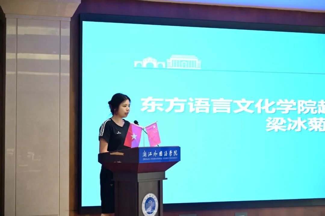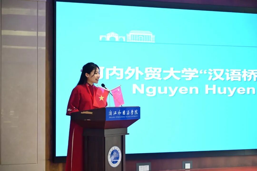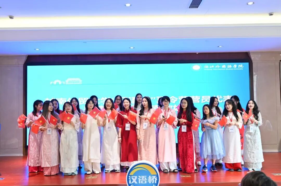 越南外贸大学“汉语桥”夏令营营员代表Nguyen Huyen Tran(阮玄庄)在发言时难掩激动之情:“能够来到素有‘人间天堂’美誉的杭州,我们心中满是激动与欣喜。” 她深情诉说着心中的期待:“我们期待在汉语课堂里感受语言的魅力,在书法笔墨中触摸文化的温度,更盼着走进西湖、良渚遗址等文化遗产,亲身感受中国的历史传承与发展活力。”