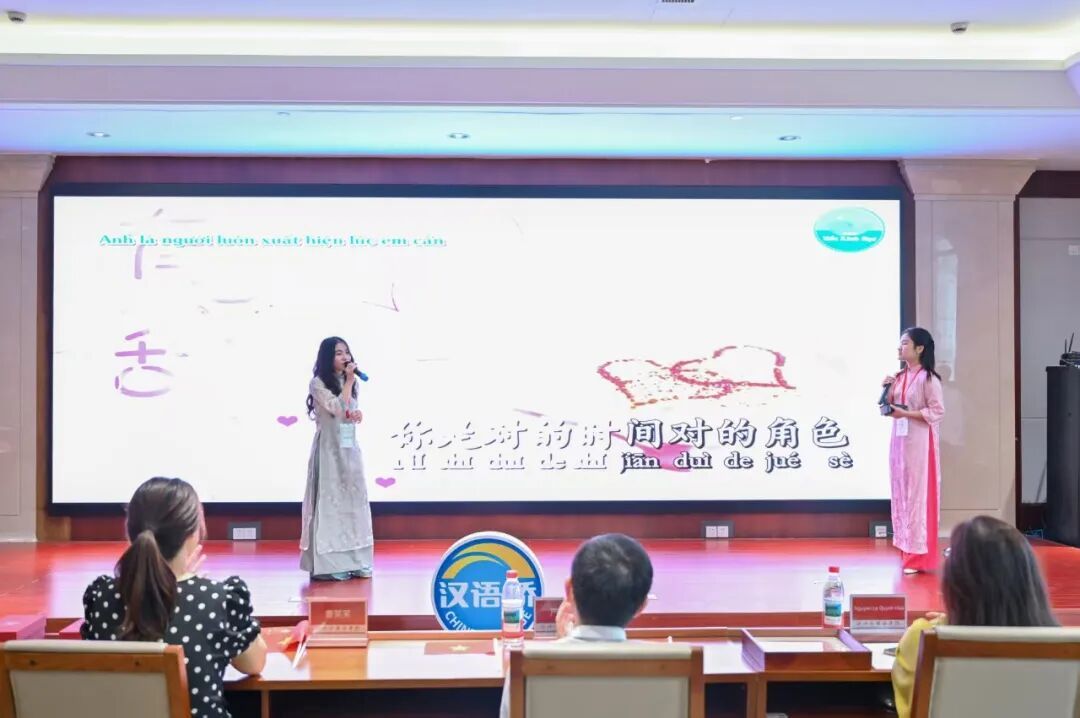 紧接着,越南外贸大学的同学们用清澈的嗓音演绎了中国流行歌曲《有点甜》,熟悉的旋律瞬间点燃全场热情,中国员工情不自禁地跟着哼唱起来。当《Xin Chào Việt Nam》的旋律响起时,整个会场化作歌声的海洋,两国学子用音乐架起心灵的桥梁。这场跨越语言的“对话”,不仅展现了语言的独特魅力,更传递出年轻一代对彼此文化的真挚热爱与无限激情。