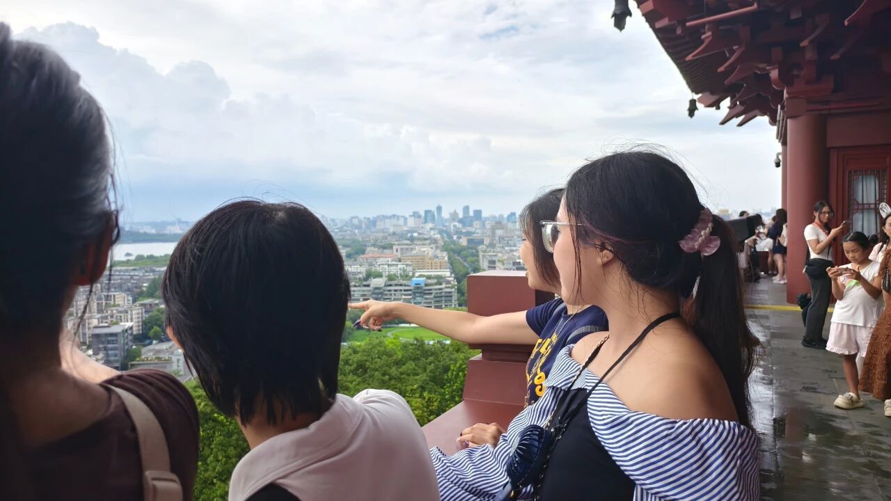 7月25日傍晚,城隍阁上,越南员工惊叹于建筑的精巧斗拱。登顶俯瞰,杭州城万家灯火尽收眼底,Khuong Minh Ngoc(姜明玉)举着手机拍摄:“这个视角太神奇了,像把杭州的历史与现代都装进了相框。”