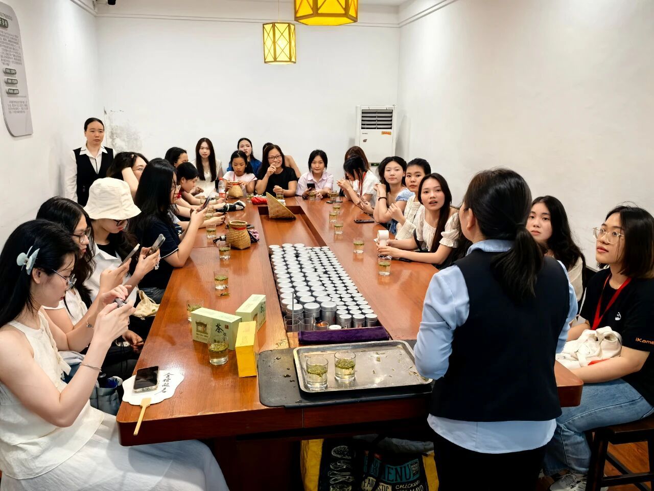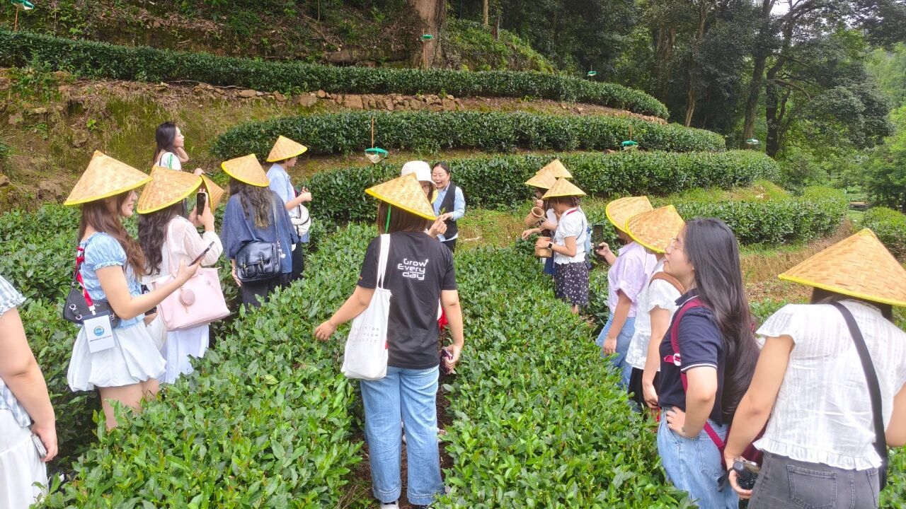 7月22日下午,师生们走进梅家坞茶村,在层层茶园中跟着采茶阿姨学习“一芽一叶”采摘。Nguyen Thuy Trang(阮水庄)捧着新炒茶叶深嗅:“这香气让我想起河内的莲花茶,但龙井的豆香更清爽!”夕阳下,中越师生围坐品茗,感受心与心民相通的温度。