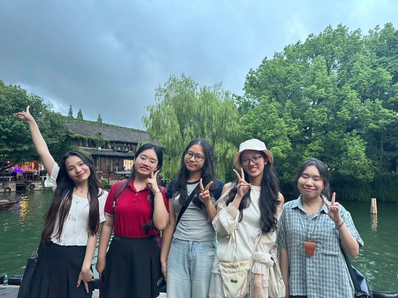 7月29日下午,细雨中的乌镇更显韵味。Nguyen Ngoc Linh(阮玉玲)轻抚斑驳老墙:“雨中的白墙黛瓦,像极了水墨画。” 茅盾纪念馆里,Do Minh Thu(杜明秋)对着民国打字机出神:“原来大作家用这样的机器创作!”染坊内,Tong Khanh Linh(童庆玲)发现越南传统奥黛与蓝印花布纹样相似,惊喜欢呼:“我们的文化早就相遇过!”雨势渐大,师生们躲进茶馆,热茶氤氲中,乌镇的温柔与友谊的温暖融为一体。