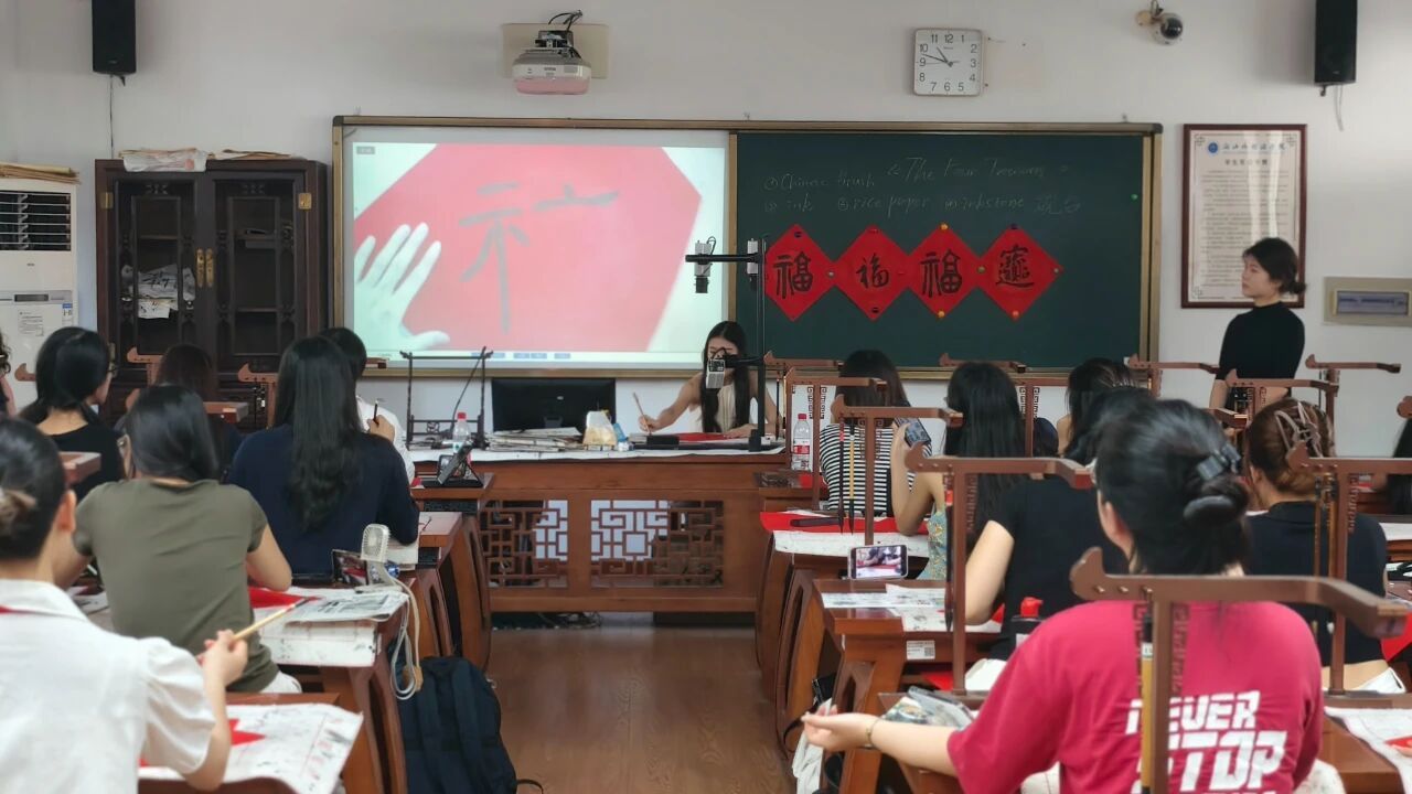 《中国书法》课上,Pham Thu Huyen(潘秋玄)握着毛笔描摹“福”字,墨汁晕染间,她笑着说:“写汉字不像写字,更像画画,每个笔画都藏着故事。”教室里的书写声与墨香,汇成独特的文化韵律。