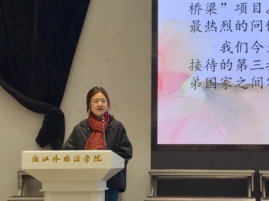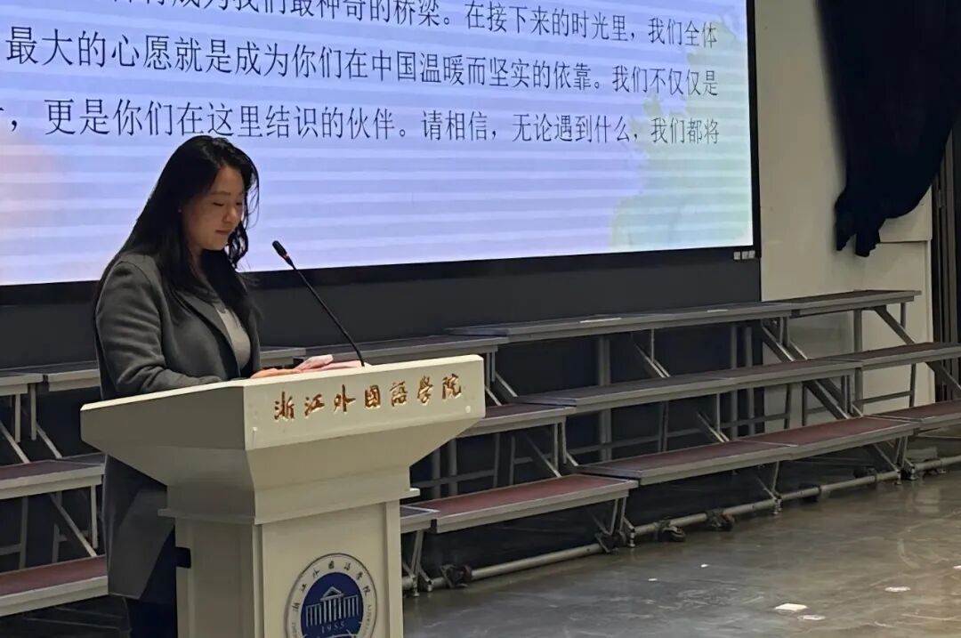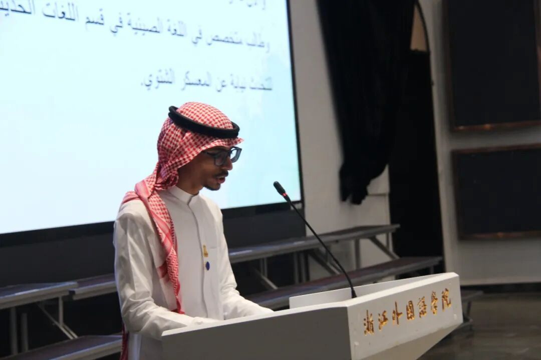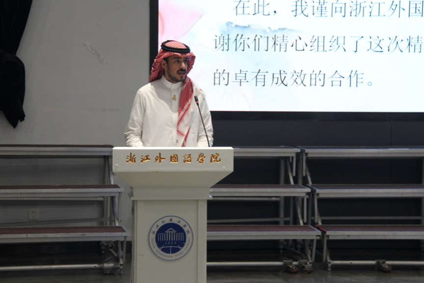 在员工代表发言环节,来自阿卜杜勒・阿齐兹国王大学中文专业的李明宇同学,尽管仅学习中文三个月,仍用较为标准的中文分享了自己在沙特学习汉语的经历,以及初到杭州的新鲜感受与喜悦之情。他表示,希望通过此次冬令营及未来的交流,结识更多中国朋友,也热烈欢迎中国朋友前往沙特做客。浙外阿语专业员工郭文基作为志愿者代表发言,她表示在接下来的活动中,志愿者们不仅将做好项目协助工作,更会成为营员在中国学习与生活中值得信赖的伙伴。郭文基提到,语言是连接彼此心灵的神奇桥梁,愿中沙员工在接下来的交流中收获知识与友谊,共同缔造一段值得永久珍藏的青春回忆。