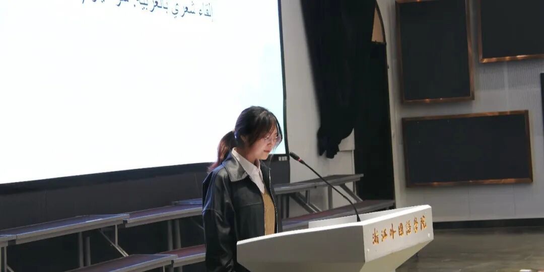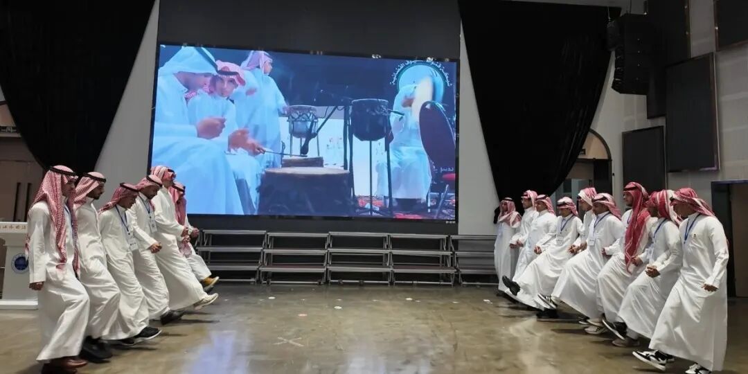 交流展示环节精彩纷呈。浙外阿语专业员工徐苗带来阿拉伯语诗朗诵《迎宾赋》,悠长的吟诵与典雅的韵律相得益彰,生动展现了中文古典文学与阿拉伯语言的跨文化融合之美,赢得了在场嘉宾与师生的一致赞誉。沙特同学们则献上了极具民族特色的传统舞蹈表演,随着节奏鲜明的音乐响起,同学们精神抖擞、动作整齐划一,充分展现了沙特传统文化的热烈氛围与独特活力。舞蹈特有的节奏感与欢庆气息,为现场增添了浓厚的异域风情,引发阵阵掌声。两场精彩表演不仅展现了中沙学子的艺术才华,更搭建起一座以艺术为纽带、以文化互鉴为核心的交流桥梁。
